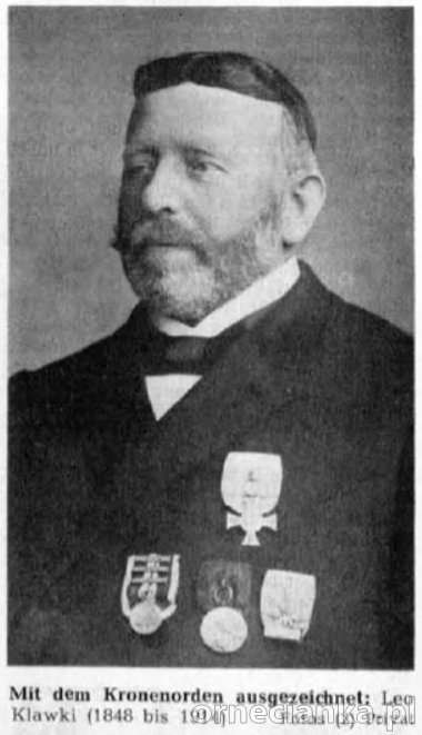 Leo Klawki urodził się 7 sierpnia 1848. Był żonaty z Marią Karbaum urodzoną w 1853 roku. Mieli 8 dzieci. Prowadził działalność gospodarczą od 1874 roku