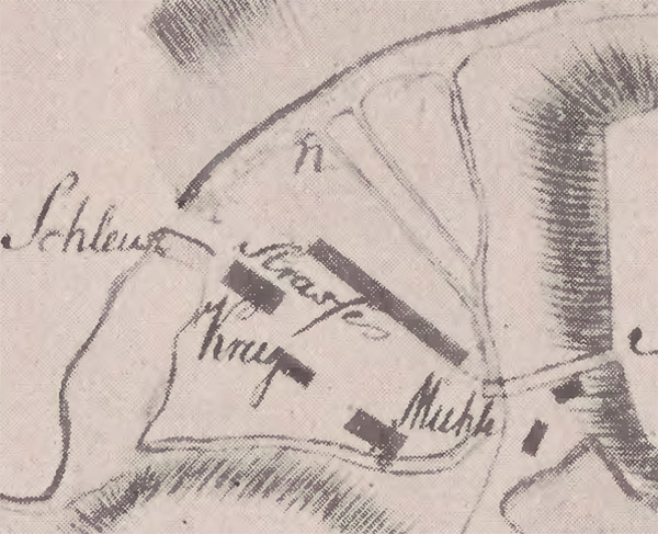 A mnie co innego zaciekawiło:na planie jeden z budynków opisany jest jako ,,krug".To po niemiecku oznacza gospodę-karczmę.Jaz jest opisany jako ,,Schleuse" czyli śluza.To też ciekawe,zwłaszcza w nawiązaniu do innego wąttku na tym forum