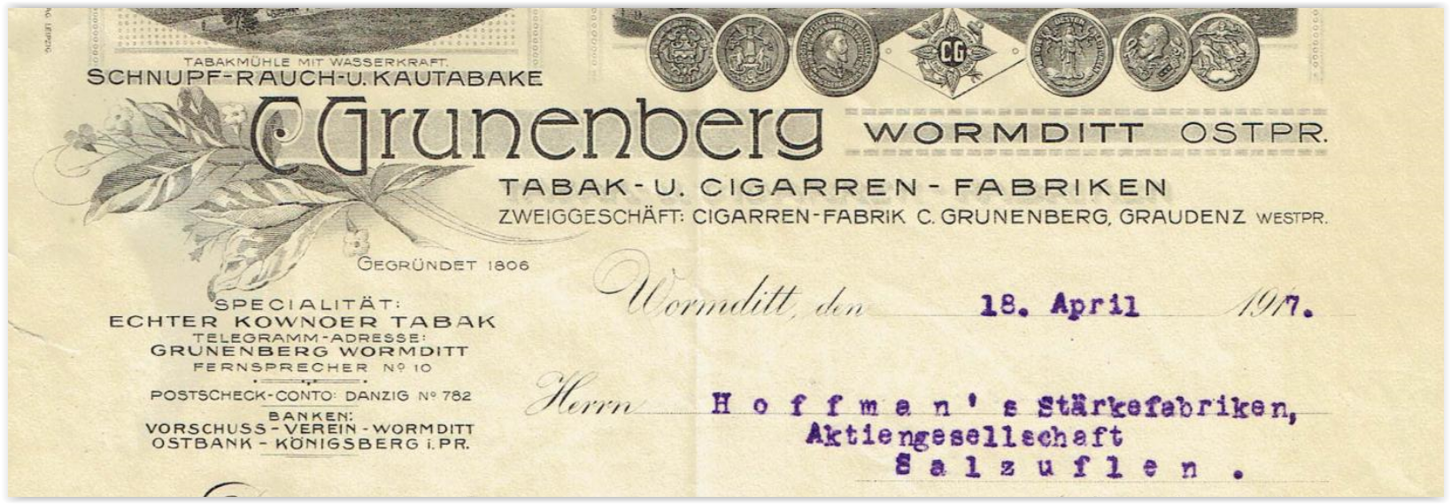 A jednak dociekliwość popłaca. Było całkowicie odwrotnie, Centrala Firmy C.Grunenberg jak również Fabryka znajdowała się w Wormditt, co wynika jednoznacznie z analizy dwóch faktur(w załączeniu). Ta z 1917r, w nagłówku ma