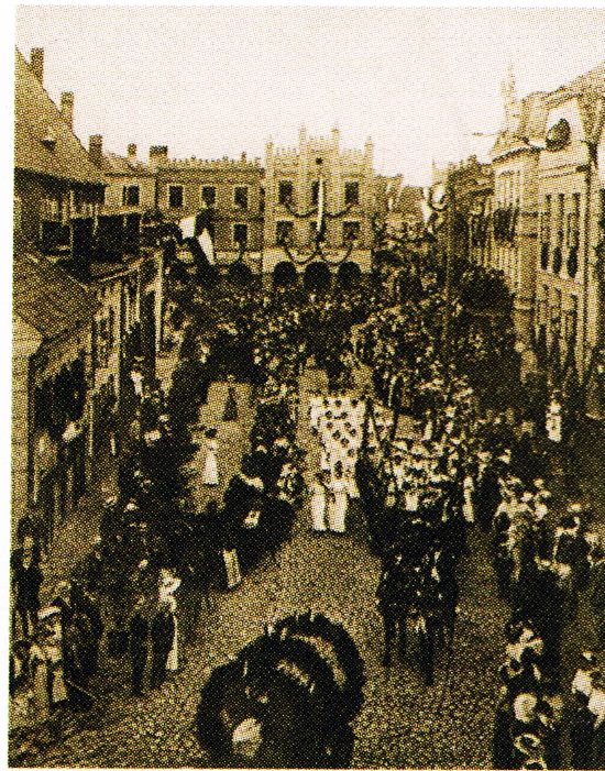Wśród ozdobnych wozów festynowych wyróżniał się wóz z herbem miasta i bocianem z małą żabą w dziobie, a na końcu stara sikawka strażacka z 1760 roku budziła szczególne zainteresowanie widzów. Pomiędzy nimi maszerowały szkoły, cechy rzemieślnicze, stowarzyszenia, a także — co warto wspomnieć — magistrat i radni miejscy. W wozach, konno lub pieszo, w barwnych ludowych strojach, przy akompaniamencie orkiestr dętych, barwny pochód przesuwał się przed gęstym tłumem widzów. Festyn ogrodowy przy hotelu , z tańcami, grami i zabawami, zakończył udane święto ludowe.